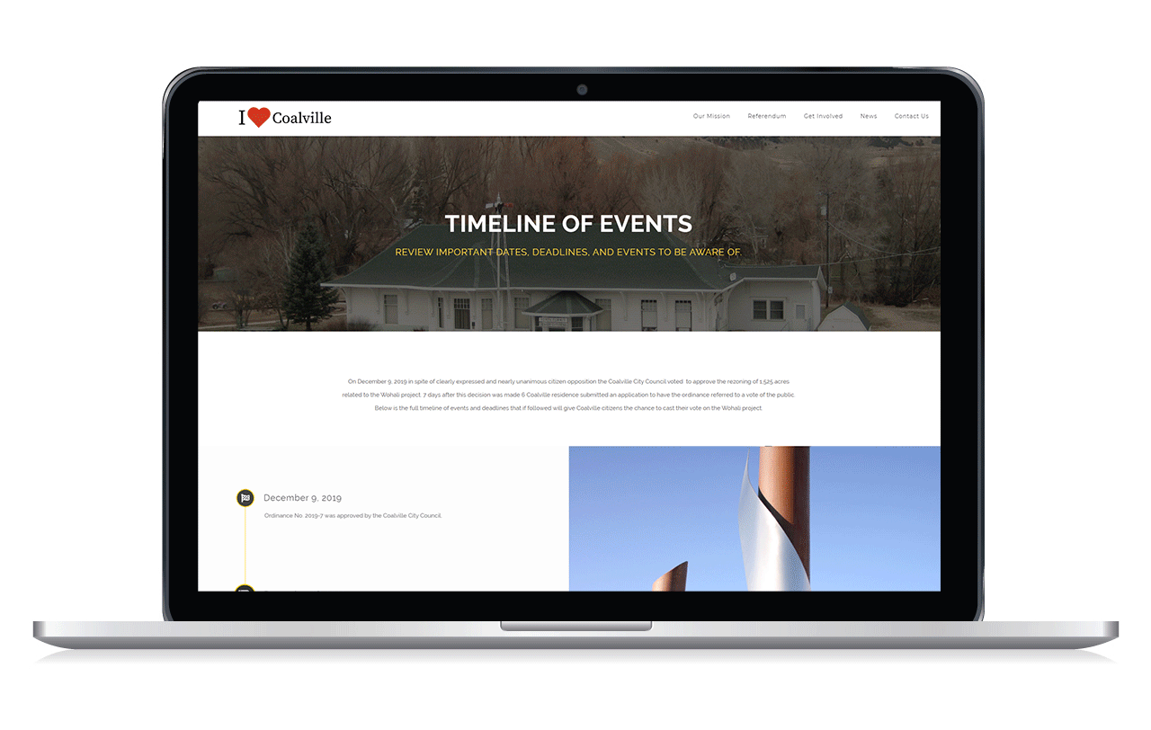 The main objective of the I Love Coalville website was to inform the citizens of Coalville about the large scale development that was happening right in their back yard. The group supports controlled development and as a result filed a referendum to give the people a vote on the topic since they didn’t feel like public input was being heard by the City Council. Since that issue and topic has progressed I Love Coalville group has since used this website to continue to inform the public and bring the community closer together.